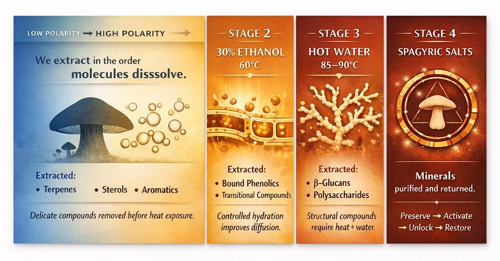 ☉ Recombination: The purified principles are recombined to create a potent, balanced elixir that captures the full spectrum of the mushroom's properties